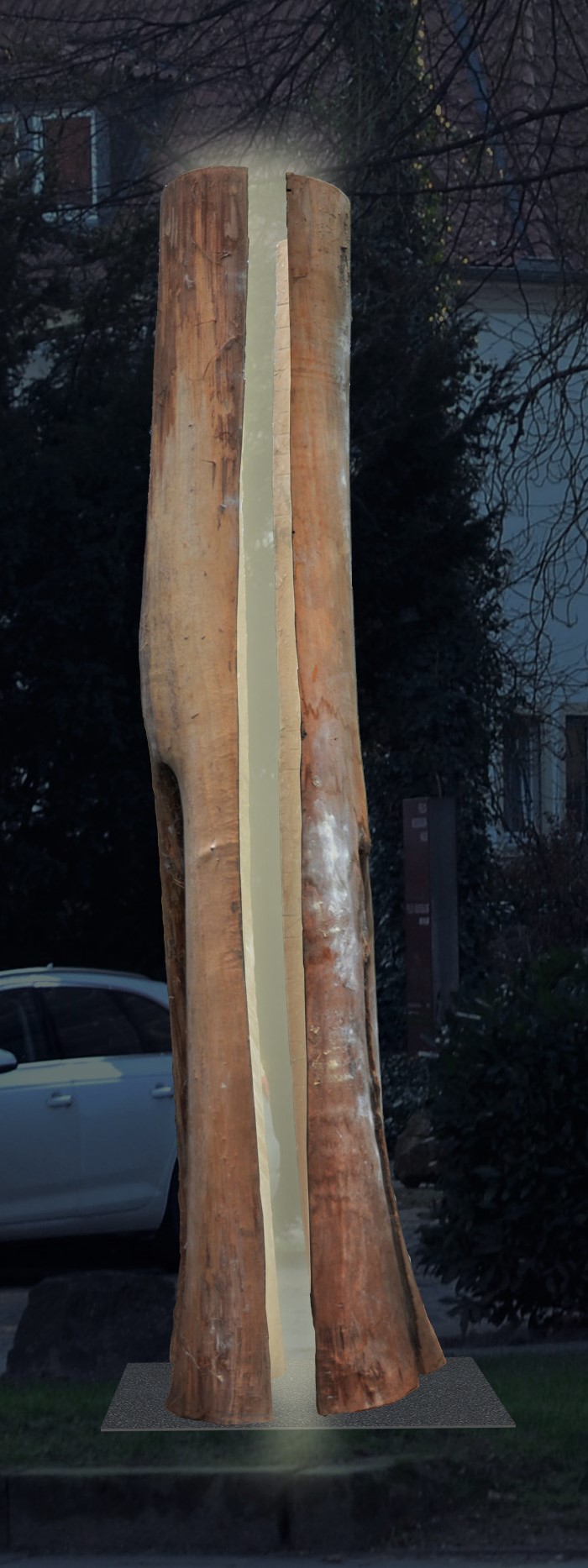 Eine ausgehöhlte Pappel formuliert einen geöffneten Innenraum vor dem Felix-Nussbaum-Haus. Tagsüber präsentiert sie sich als fragiler, ruhiger Kontrast zu den lebendigen, massiven Bäumen und dem dynamischen Stadtraum.